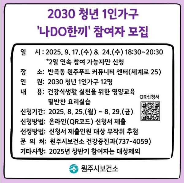 [헬스앤마켓리포터스, 조태익기자] 원주시보건소는 2030 청년 1인 가구의 건강한 식습관 형성 및 영양관리 지원을 위해 ‘나DO한끼’ 프로그램을 운영한다.