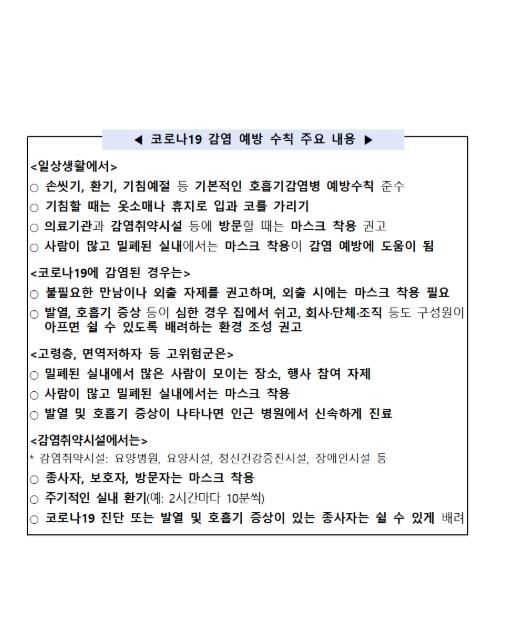 한편, 코로나19 예방을 위해서는 ▲손 씻기 생활화 ▲기침 예절 준수 ▲고령층·기저질환자의 다중이용시설 방문 자제 ▲밀폐된 실내 마스크 착용 ▲발열 및 호흡기 증상 시 신속한 진료 등이 무엇보다 중요하다고 시는 전했다.