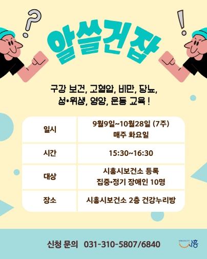 [헬스앤마켓리포터스, 조태익기자] 시흥시는 오는 9월 9일부터 10월 28일까지 관내 장애인의 건강관리를 돕기 위해 ‘알쓸건잡(알아두면 쓸모 있는 건강 잡학사전)’ 프로그램을 시흥시보건소 2층 건강누리방에서 운영한다.