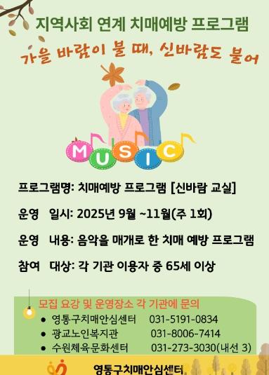 영통구치매안심센터 관계자는 “신바람 교실은 어르신들이 음악으로 자신감을 회복하고 또래와 소통하며 활력을 얻는 계기가 될 것”이라며 “민·관 협력으로 어르신의 참여 기회를 확대하겠다”고 말했다. 이어 “지역사회 통합과 사회적 가치를 실현하는 다양한 활동을 이어가겠다”고 덧붙였다.