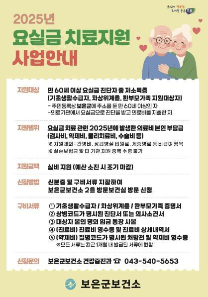 의료비 지원 대상은 보은군에 주소를 둔 만 60세 이상 기초생활수급자, 차상위 계층, 한부모가족 지원대상자 등 저소득층 주민이며, 요실금 진단을 받고 2025년 1월 이후 의료비를 지출한 경우 검사비·약제비·물리치료비·수술비 등 본인 부담 의료비를 연 최대 100만 원 한도 내에서 실비 지원받을 수 있다. 단, 간병비, 상급병실 입원료, 제증명료 등 비급여 항목은 지원 대상에서 제외된다.