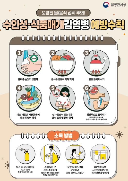 수인성·식품매개 감염병 예방을 위해서는 ▲흐르는 물에 비누로 30초 이상 손 씻기 ▲음식 충분히 익혀 먹기 ▲물 끓여 먹기 ▲식재료 세척·보관 철저히 하기 ▲설사 증상이 있는 경우 음식 조리 및 준비 금지 ▲위생적으로 조리하기 등 기본 수칙을 실천하는 것이 중요하다.