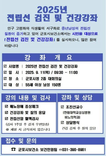 군포시, 55세 이상 남성 체크 필수...전립선암 무료검진 및 건강강좌 실시