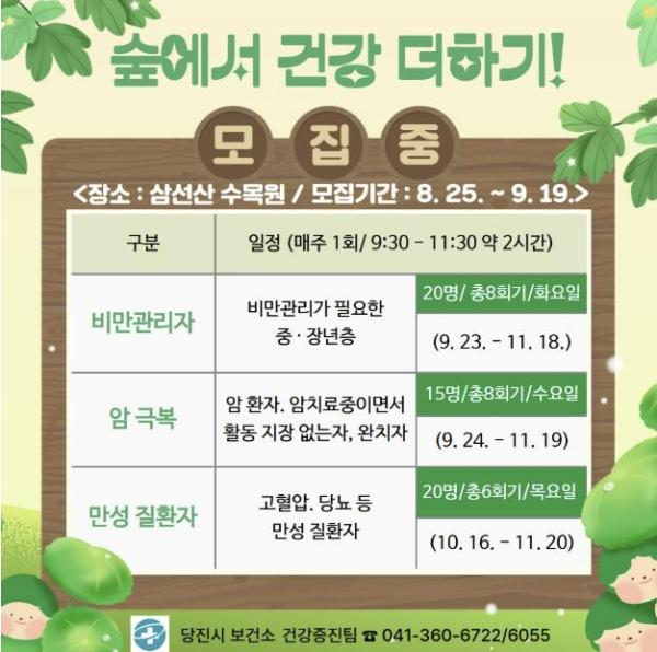 [헬스앤마켓리포터스, 조태익기자] 당진시보건소는 건강관리가 필요한 질환자 맞춤 건강관리를 위해 ‘숲에서 건강 더하기’ 프로그램을 9월 23일부터 11월 20일까지 삼선산 수목원에서 진행한다고 10일 밝혔다.