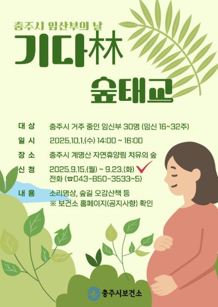 [헬스앤마켓리포터스, 조태익기자] 충주시는 임산부의 날(10월 10일)을 기념해 지역 임신부들을 위한 특별한 산림치유 프로그램을 개최한다.