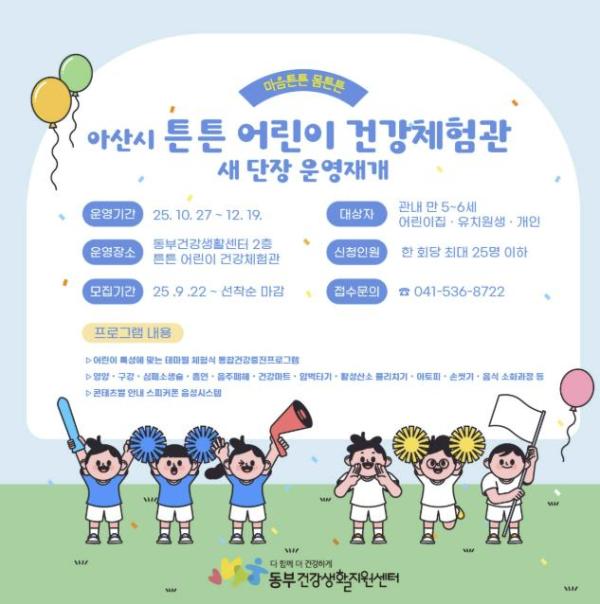[헬스앤마켓리포터스, 조태익기자] 아산시는 내부 환경 개선으로 운영을 중단했던 어린이 건강체험관을 10월 27일부터 재개관하고, 체험 프로그램에 참여할 단체 등을 모집한다고 밝혔다.