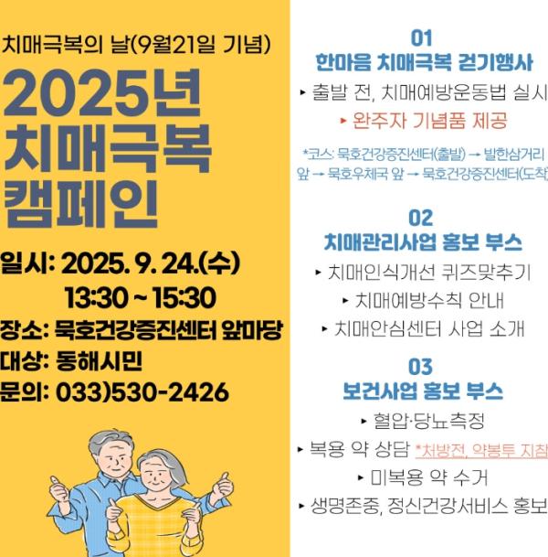 [헬스앤마켓리포터스, 조태익기자] 동해시는 2025년 치매극복의 날(9월 21일)을 맞아 치매에 대한 인식개선과 예방·관리의 중요성을 널리 알리기 위해 오는 9월 24일 오후 1시 30분 묵호건강증진센터 앞마당에서 기념 캠페인을 개최한다.