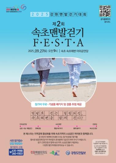 [헬스앤마켓리포터스, 조태익기자] 속초시는 강원특별자치도 및 강원도민일보와 함께 오는 9월 27일 속초해수욕장에서 외옹치해수욕장 구간을 따라 ‘제2회 2025 속초시 강원 맨발걷기 대회’를 연다. 지난해에 이어 두 번째로 마련되는 이번 대회는 자연 속에서 맨발로 걸으며 건강과 힐링을 동시에 경험할 수 있는 특별한 축제다.