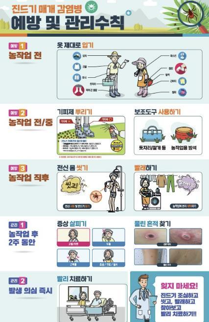 또한 △외출 후에는 옷을 꼼꼼히 털고, 바로 샤워하며 진드기를 제거 △ 풀밭 위에 옷을 벗어 놓거나 눕지 않아야 하며, 야외활동 후 2주 이내에 고열, 두통, 오한 등 의심 증상이 나타나면 즉시 의료기관을 방문해 진료받아야 한다.