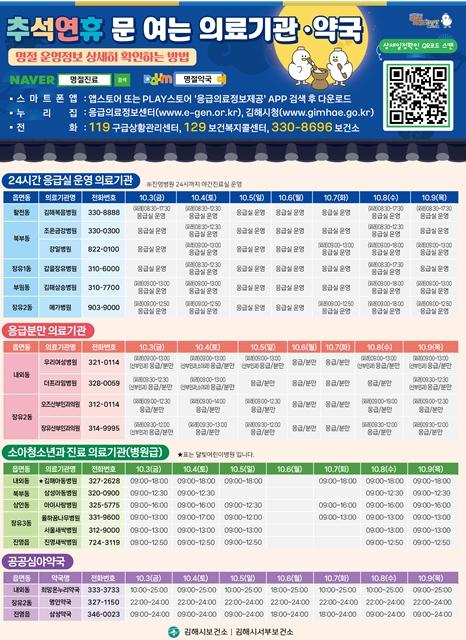 연휴 기간 응급의료기관인 김해복음병원, 조은금강병원, 강일병원, 갑을장유병원과 응급의료시설인 김해삼승병원, 메가병원은 24시간 응급실을 운영하고 이외 병의원 299개소, 약국 143개소가 일자별로 문을 연다.