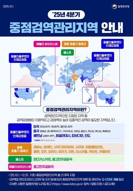 이달 선언된 콩고민주공화국 내 에볼라바이러스병 유행 추가로 총 4종의 검역감염병(동물인플루엔자 인체감염증, 중동 호흡기 증후군, 페스트, 에볼라 바이러스병) 대상 21개국이 4분기(10.1.~12.31) 중점검역관리지역으로 지정됐다.