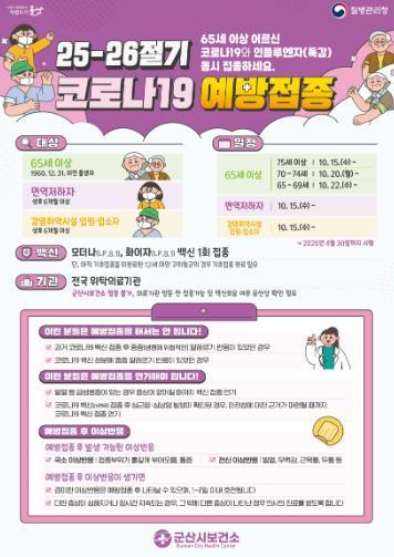 대상은 19~59세 취약계층, 14~18세 및 60~64세 군산시민, 보육 돌봄 종사자이며, 신분증을 지참하여 지정의료기관을 방문하면 접종할 수 있다.