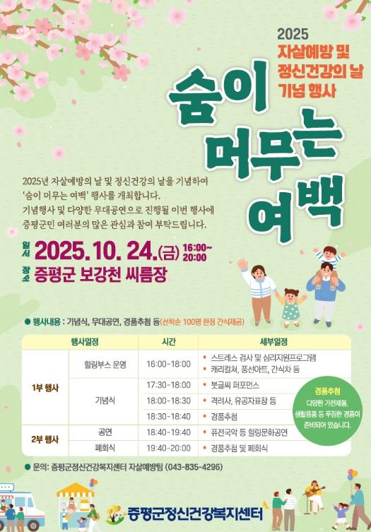 [헬스앤마켓리포터스, 조태익기자] 충북 증평군정신건강복지센터가 오는 24일 오후 4시 보강천 씨름장 특설무대에서 자살예방 및 정신건강의 날 행사를 개최한다.