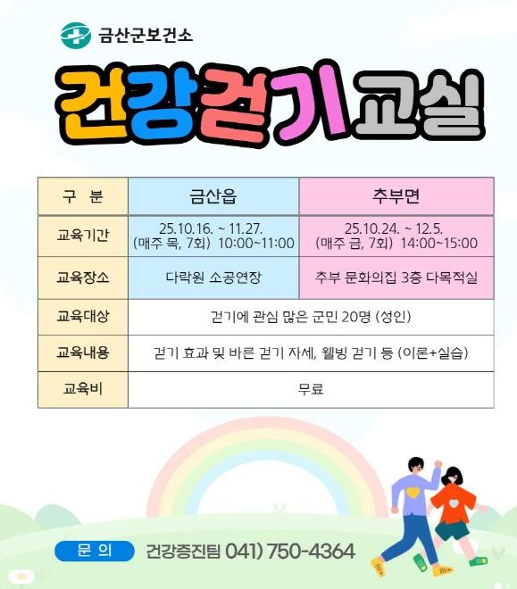 [헬스앤마켓리포터스, 조태익기자] 금산군보건소는 군민의 건강증진과 생활 속 신체활동 실천을 위해 오는 12월까지 금산읍·추부면에서 건강 걷기 교실을 운영한다.