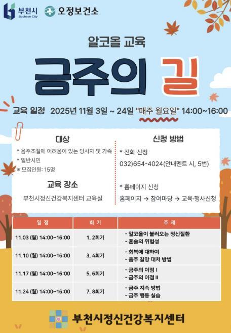 [헬스앤마켓리포터스, 조태익기자] 부천시는 부천시정신건강복지센터와 함께 알코올 문제로 어려움을 겪는 시민의 회복을 지원하기 위해 11월 3일부터 11월 24일까지 매주 월요일 오후 2시부터 4시까지 ‘금주의 길’ 프로그램을 운영한다.