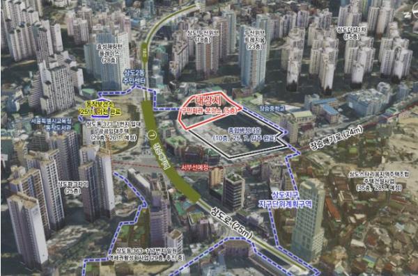 대상지는 지하철 7호선 장승배기역과 개통 예정인 서부선이 연결되는 환승역세권으로, 우수한 교통 접근성을 갖추고 있다. 특히 동작구청 신청사와 함께 장승배기 일대 도시공간 구조 재편의 핵심 거점으로 평가받는다.