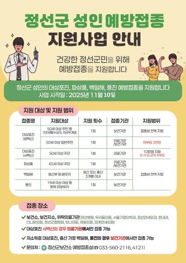 군은 정선군에 주민등록을 둔 지역 주민과 결혼이민자를 대상으로 대상포진, 파상풍, 백일해, 풍진 등 예방접종을 지원한다.
