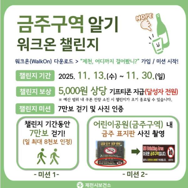 이번 챌린지는 걷기 활성화와 금주구역 홍보를 목적으로 하며,‘워크온(WalkOn) 앱’을 통해 제천시민이라면 누구나 참여할 수 있다.
