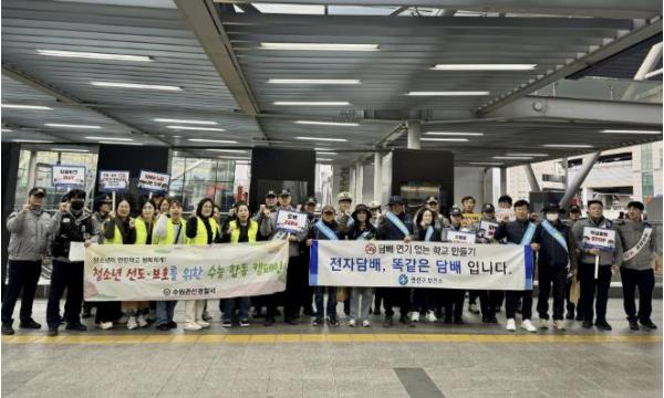 수원역 인근 피시(PC)방, 호프집 등 청소년 취약 시설을 방문해 술·담배 판매 금지를 안내하고, 점검을 병행했다. 또 흡연금지구역에서 담배를 피우는 이들을 계도하고, 담배꽁초 줍기 등 환경정비 활동도 했다.