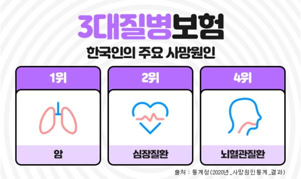 [헬스앤마켓리포터스, 강동진기자] 한국인의 주요 사망원인중에 암, 뇌혈관질환, 심혈관질환은 흔히 3대질병이라 일컬어지며 살아가면서 가장 먼저 대비해야 하는 중대질병으로 항상 강조되고 있다. 이들 질병에 미리 대비하기 위해 가입하는 것이 진단비보험인데, 이러한 3대질병진단비를 중점으로 보장하는 보장성보험이 3대진단비보험 이다. 3대질병진단비보험은 각각의 질병에 주목해서 보장하기도 하지만, 나에게 맞는 추가 특약을 잘 골라서 가입한다면 종합건강보험으로도 충분히 활용도가 높다.