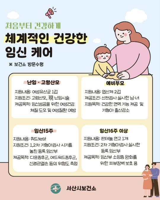 지원 대상은 예비 부모 및 초기 임산부면서 서산시 보건소에 임산부 등록을 했거나 보건소 산전 검사를 한 시민이다.