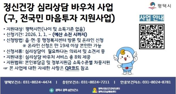 [헬스앤마켓리포터스, 조태익기자] 평택시에서는 시민의 마음 건강을 지키고 자살 예방 및 정신질환 조기 발견을 돕기 위한 ‘정신건강 심리상담 바우처사업’을 2026년에도 계속 추진한다.