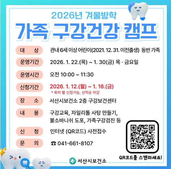 6세 이상 자녀를 둔 가족 16팀(약 64여 명)을 대상으로 하며, 서산시보건소 구강보건센터에서 사전예약제로 운영된다.