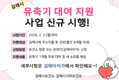 [헬스앤마켓리포터스, 조태익기자] 김해시는 출산가정의 경제적 부담을 완화하고 건강한 양육 환경 조성을 위해 오는 2월 2일부터 ‘유축기 대여 지원 사업’을 본격적으로 시행한다고 29일 밝혔다.