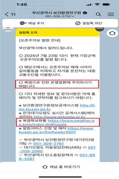 이번 서비스는 부산지역 27개 도시대기측정소의 실시간 기온 자료를 활용해 시민들에게 폭염 상황을 신속히 알리고, 온열질환 등 건강 피해를 예방하고자 마련됐다.