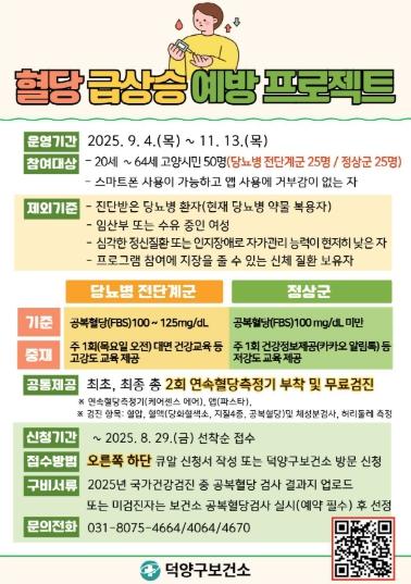 [헬스앤마켓리포터스, 조태익기자] 고양특례시 덕양구보건소는 당뇨병 전단계자의 건강한 생활습관 형성과 조기 예방관리를 위해 9월부터 운영 예정인 ‘혈당 급상승 예방 프로젝트’의 참여자를 모집한다고 밝혔다.