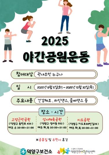 덕양구보건소 관계자는 “앞으로도 지역주민들의 건강한 삶과 활기찬 일상 유지를 위해 다양한 프로그램을 체계적으로 운영하고, 안전하고 쾌적한 환경에서 참여할 수 있도록 지속적인 노력을 기울일 것”이라며 “8월부터 재개되는 야간공원운동에 많은 참여를 부탁드린다”라고 전했다.