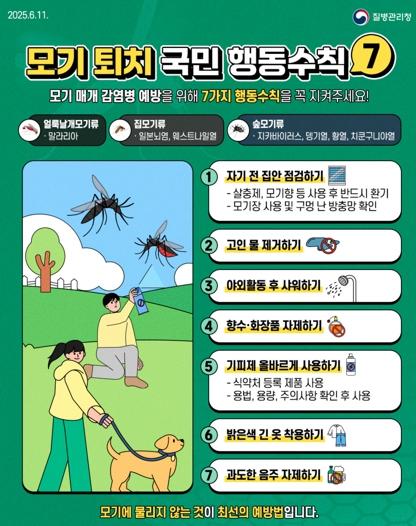 이 밖에도 일본뇌염 바이러스를 사전 예방하기 위해서는 모기에 물리지 않도록 ▲외출 시 밝은 색 긴 옷 착용 ▲모기 기피제 사용 ▲창문 방충망 점검 ▲화분받침·물통·폐타이어 등 고인 물 제거를 비롯한 생활 속 모기물림 예방 수칙을 실천하는 것이 중요하다.