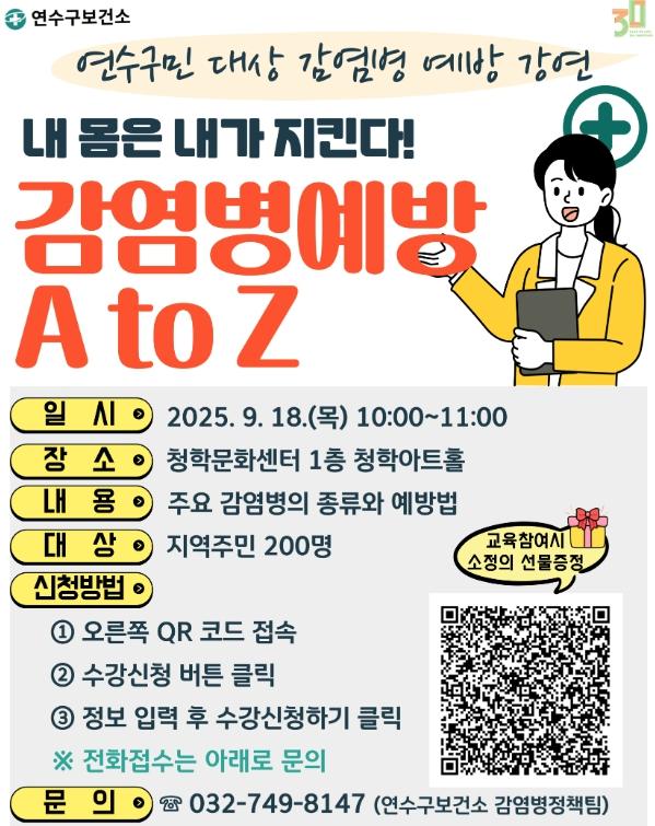 [헬스앤마켓리포터스, 조태익기자] 연수구는 다음 달 18일 청학문화센터 1층 청학아트홀에서 열리는 감염병 예방 특강 ‘내 몸은 내가 지킨다! 감염병 예방 A to Z’의 수강생을 모집한다.