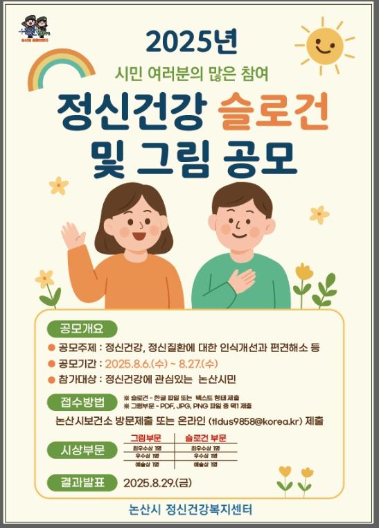 [헬스앤마켓리포터스, 조태익기자] 논산시는 정신건강에 대한 시민들의 관심을 높이고 정신질환에 편견을 해소하기 위해 27일까지 ‘2025년 정신건강 슬로건 및 그림 공모전’을 개최한다.