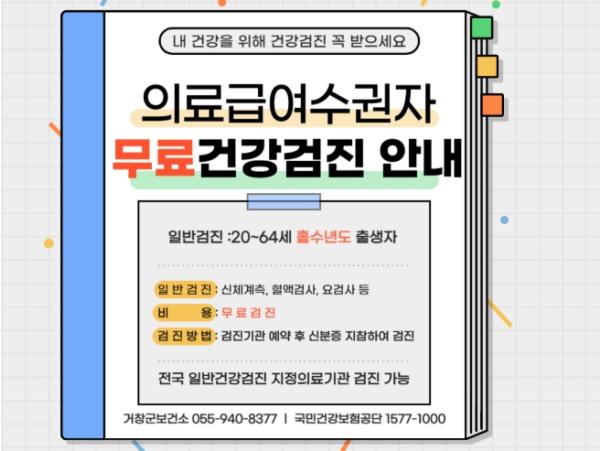 [헬스앤마켓리포터스, 조태익기자] 거창군은 의료급여수급권자의 건강증진과 만성질환 조기 발견을 위해 일반건강검진 사업을 연중 무료로 실시하고 있으며, 대상자의 조기 수검 참여를 적극 독려하고 있다고 지난 5일 밝혔다.