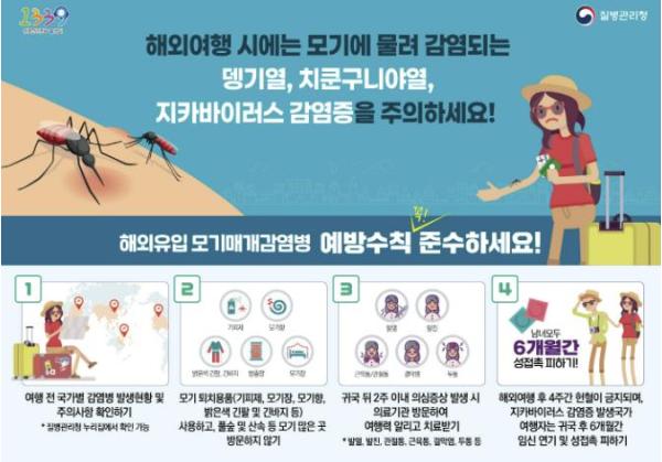 해외여행을 계획한다면 출국 전 질병관리청 누리집에서 여행 국가의 감염병 발생 현황 및 주의 사항을 확인하고, 모기 기피제와 밝은색 긴 옷을 준비한다. 여행 중에는 모기 기피제를 3~4시간 간격으로 사용하고, 새벽과 해 질 녘에는 야외활동을 자제하는 게 좋다. 또한, 흐르는 물에 손과 피부를 자주 씻고 위생 관리를 철저히 해야 한다.