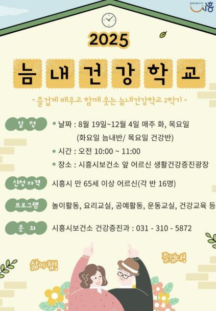 [헬스앤마켓리포터스, 조태익기자] 시흥시는 어르신들의 신체 및 인지 건강을 증진하고 활기찬 노후를 지원하기 위한 늠내건강학교 2학기 프로그램을 오는 8월 19일부터 시작한다.