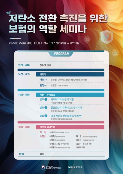 대통령직속 2050 탄소중립녹색성장위원회와 보험연구원(원장 안철경)은 8월 25일 한국프레스센터(서울)에서 ‘저탄소 전환 촉진을 위한 보험의 역할’ 세미나를 개최했다.