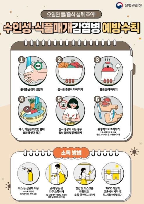 수인성·식품매개 감염병 예방을 위해서는 ▲흐르는 물에 비누로 30초 이상 손 씻기 ▲음식 충분히 익혀 먹기 ▲물 끓여 먹기 ▲식재료 세척·보관 철저히 하기 ▲설사 증상이 있는 경우 음식 조리 및 준비 금지 ▲위생적으로 조리하기 등 기본 수칙을 실천하는 것이 중요하다.