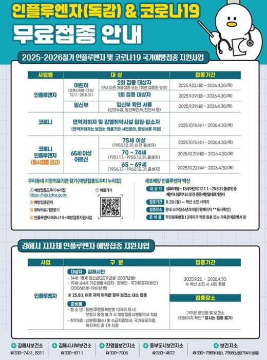 [헬스앤마켓리포터스, 조태익기자] 김해시는 오는 22일 어린이, 청소년을 시작으로 임산부, 65세 이상 어르신을 대상으로 인플루엔자 무료접종을 순차적으로 실시한다고 12일 밝혔다. 특히 김해시는 올해부터 무료접종 대상을 청소년(14~18세, 2007~2011년생)까지 확대해 접종 사각지대를 줄이고 예방효과를 높인다.