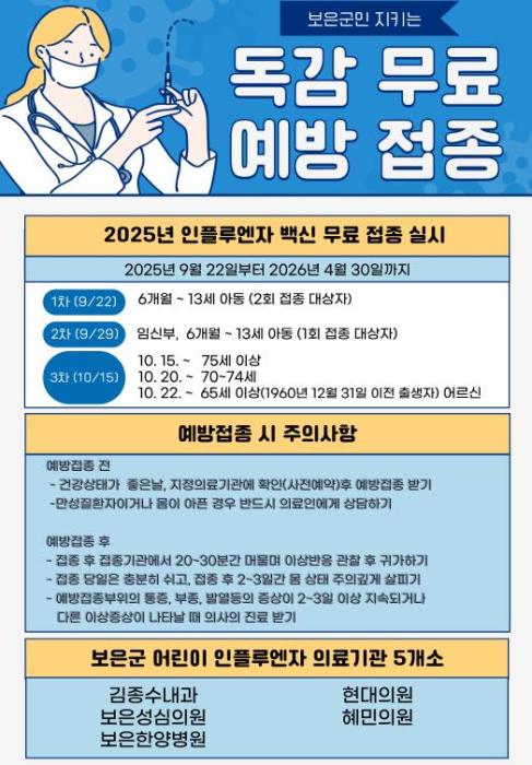 예방접종은 △김종수 내과 △현대의원 △보은성심의원 △혜민의원 △보은한양병원 등 5개 의료기관에서 받을 수 있으며 일정은 △2회 접종 대상 어린이는 9월 22일부터, △1회 접종 대상 어린이와 임신부는 9월 29일부터 접종이 가능하다. 또한 보은군보건소는 오는 10월 22일부터 다자녀가정 무료 접종을 비롯해 어린이 및 임신부 접종을 진행한다.