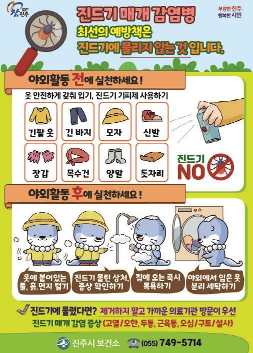 [헬스앤마켓리포터스, 조태익기자] 진주시는 본격적인 가을철을 맞아 야외활동이 늘어남에 따라 중증열성혈소판감소증후군(SFTS)과 쓰쓰가무시증 등 진드기 매개 감염병 예방을 위해 시민들에게 감염병 예방수칙 준수를 철저히 당부했다.