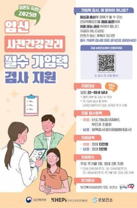 여성에게는 난소기능검사와 부인과 초음파 검사 비용을 최대 13만원, 남성에게는 정액검사(정자정밀형태검사) 비용을 최대 5만원 지원한다.