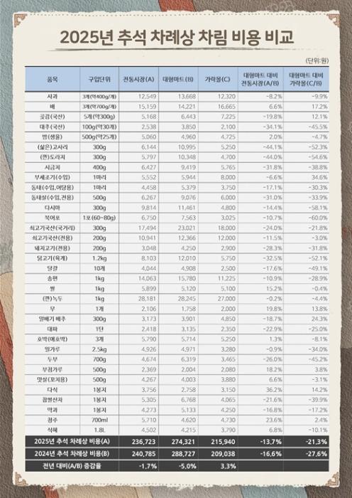 대형마트는 과일(배), 곡류(쌀), 가공식품(부침가루·맛살·다식·청주·식혜) 가격이 더 낮았다