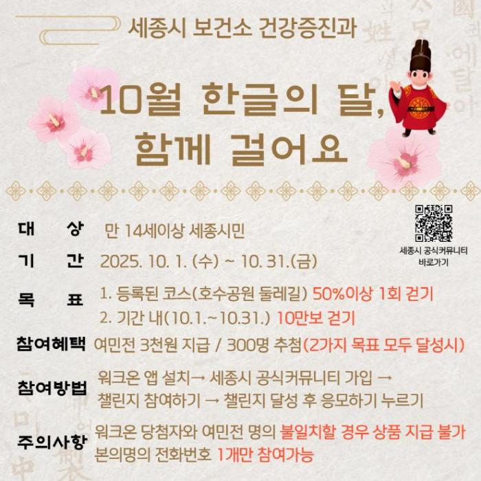 [헬스앤마켓리포터스, 조태익기자] 세종특별자치시 보건소가 1일부터 31일까지 한글날을 맞아 ‘10월 한글의 달 함께 걸어요’ 걷기 도전 행사를 운영한다.