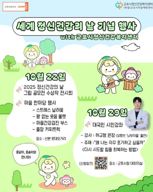 김미경 군포시보건소장은 “우울과 불안 등 정신건강 문제는 누구에게나 찾아올 수 있다. 이번행사를 계기로 시민들도 스스로와 주변사람들의 정신건강에 관심을 가져주시기를 당부드린다”며 “누구나 마음 편히 정신건강 서비스를 이용할 수 있는 계기가 되기를 바란다”고 말했다.