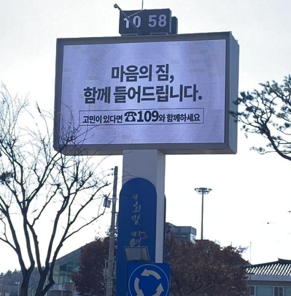 전광판에는 ▲마음의 봄은 반드시 찾아옵니다 ▲작은 희망이 큰 내일을 만듭니다 ▲당신의 이야기에 귀 기울입니다(☎109) 등 짧지만 따뜻한 의미를 담은 문구들이 송출되고 있다.