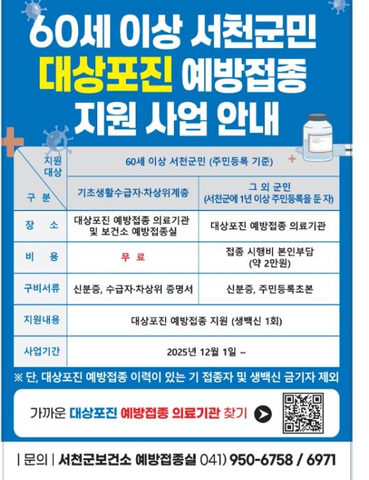 [헬스앤마켓리포터스, 조태익기자] 서천군은 고령층의 대상포진 발병과 합병증을 예방하고 건강한 노후를 지원하기 위해 오는 12월 1일부터 대상포진 예방접종 지원사업을 본격 추진한다.
