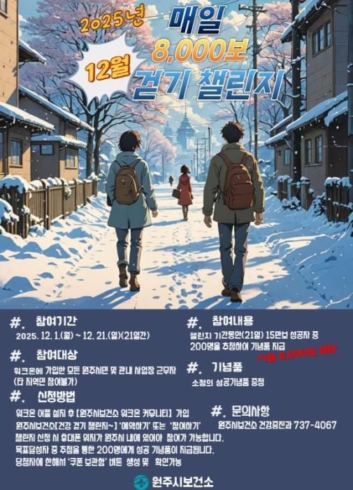 [헬스앤마켓리포터스, 조태익기자] 원주시보건소는 보건소와 함께하는 12월 건강 걷기 챌린지를 운영한다.
