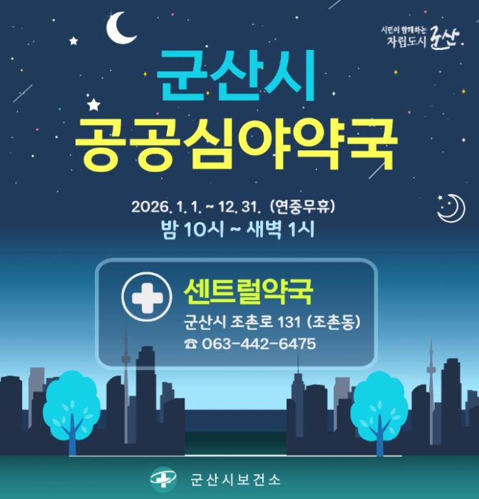 공공심야약국(센트럴약국, 군산시 조촌로 131)은 오후 10시부터 다음날 새벽 1시까지 365일(연중무휴) 운영되며, 심야시간대에도 약사와의 상담을 통해 안전한 의약품 복용이 가능하도록 지원하고 있다.